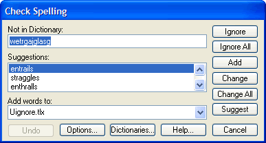 | Ignore All | Click to skip this and all further occurrences of a misspelled word. You might use this button if the word reported as a misspelling is actually spelled correctly. If the word is one you use frequently, you may wish to ignore it permanently by selecting the Add button. |