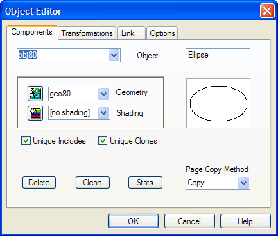 Use the Components Tab on the Object Editor dialog box to control an object’s geometry, shading, and copy options. You may also clean your project of unneeded objects or components.