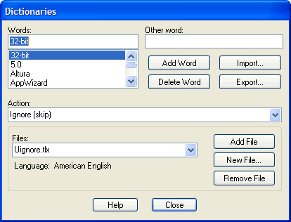 | Words | Contains the list of words in the currently selected dictionary. You may enter words in the Word box, but the total length should be limited to 63 characters. |