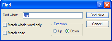 | Direction | Click the radio button corresponding to the direction to search starting from the insertion point in the document. Click Up to search from the insertion point to the top. Click Down to search from the insertion point to the bottom. |