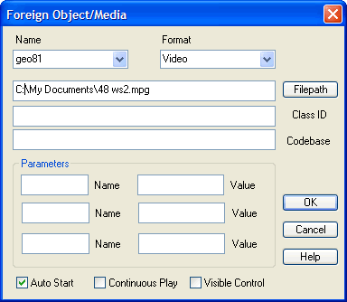 | Auto Start | Click to checkmark to set the embedded media object to execute without user intervention. Available only with General Plug-In, Java Applet, Shockwave, Flash, QuickTime, RealAudio, Video, Sound/Music, or Other File Type format. |