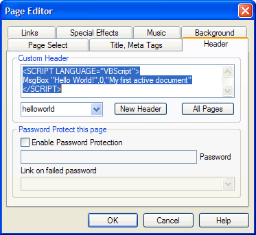 | Custom Header | Select a header from the Header Selection dropdown menu, or click the New Header button. Enter script statements, style sheet declarations, or other custom header information to be added to the <HEAD> section of the current page. |
