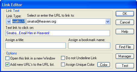 Add New URLs to the URL List Click to checkmark to automatically add any hyperlink addresses you enter in the Select URL field to the Link Manager. For more information, see Link Manager Dialog Box.