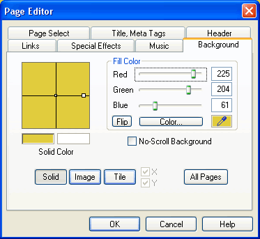 The Page Editor dialog box allows you to set various page properties, such as page name, title and meta tag information, special effects, music, and page backgrounds.