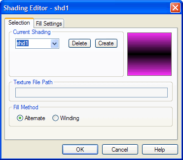 Use the Selection Tab of the Shading Editor dialog box to select a shading component for editing, create a new shading component, or set a texture file path or fill method.