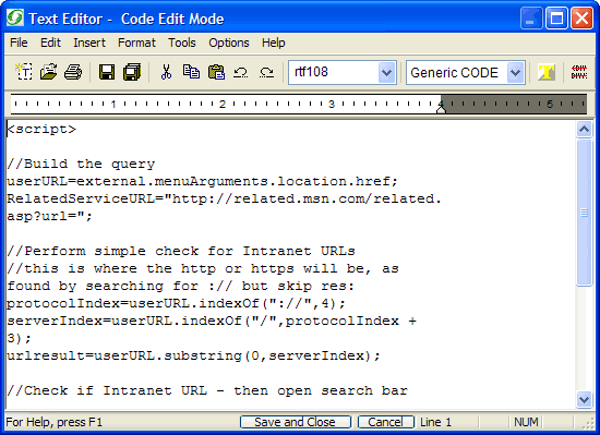 The Text Editor in Code Edit Mode features a menu bar and toolbar that offer several tools and editing options – most notably the No CSS Positioning option – although not as many as in Text Edit Mode. For full descriptions of the options available in the menus and the toolbar, see Text Editor Dialog Box (Text Edit Mode).