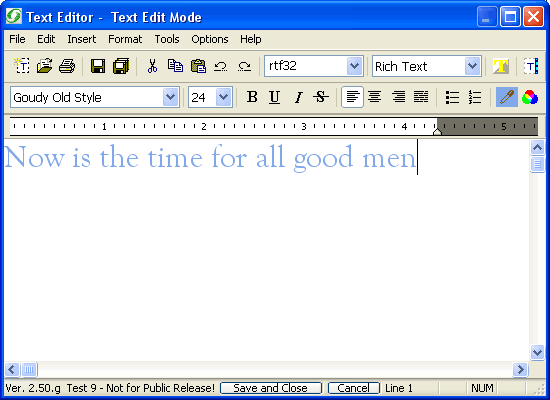 | Save and Close | Click to accept the current state of the text in the Text Editor, close the dialog box, and return to the Work Window. The text object will be made available for positioning or transformation in the Work Window. |