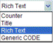Format Selection &endash; Select an object format from the drop-down menu. Choose among Title, Rich Text, or Generic Code. (Counter format is not available in SiteSpinner® Pro.) The Text Editor will change to accommodate the format selected. |